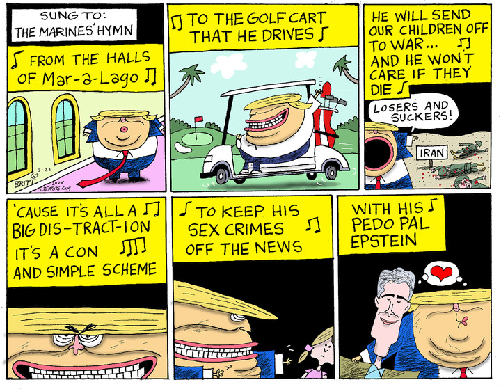 A self-described liberal, Britt nevertheless delights in skewering deserving politicians of every persuasion. His numerous awards include first place for editorial cartooning from the Washington Press Association in 1995, the National Press Foundation's Berryman Award as editorial cartoonist of the year in 1994, and the Sigma Delta Chi Award for editorial cartooning from the Society of Professional Journalists in 2009.