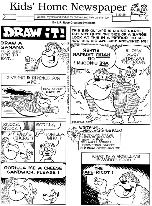Creator John Rose always wanted to be a cartoonist. He started drawing on his parents' living room walls and continued throughout his school years in the margins of his test papers (hoping for extra credit). The Virginia-born Rose graduated from James Madison University in 1986 with a bachelor's degree in art and art history. After graduation, he drew freelance sports cartoons for newspapers in Manassas, Va. He joined Byrd Newspapers of Virginia in 1988, starting at the Warren Sentinel in Front Royal and then moving to the Harrisonburg Daily News-Record where he continues to work today. His cartoons have won awards from the National Newspaper Association and the Virginia Press Association. Rose also creates Kids' Home Newspaper, a weekly children's cartoon/activity page for Creators Syndicate. Syndicated since 1991, this feature has spawned three activity books: "Fun With Pup!" (1996), "More Fun With Pup!" (1998) and "Christmas Fun With Pup!" (2000), all published by Pelican Publishing Co. The feature's e-mail address is puptoon@aol.com. Rose is a member of both the National Cartoonists Society and the Association of American Editorial Cartoonists. He lives with his wife, Karen, and daughters, Meredith and Sarah, in the mountains of Harrisonburg, Va. In his free time, he enjoys spending time with his family, freshwater fishing and eating pizza.